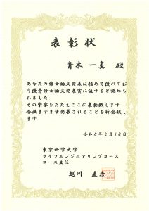 青木(M2)が ライフエンジニアリングコース3月修了修論発表会で 「優秀修士論文発表賞」 を受賞 2026-02-25 最終更新日時 : 2026-02-25 azuma 青木(M2)が ライフエンジニアリングコース3月修了修論発表会で「優秀修士論文発表賞」を受賞しました。発表題目は、「自動車用超音波ソナーの指向特性最適化」です。