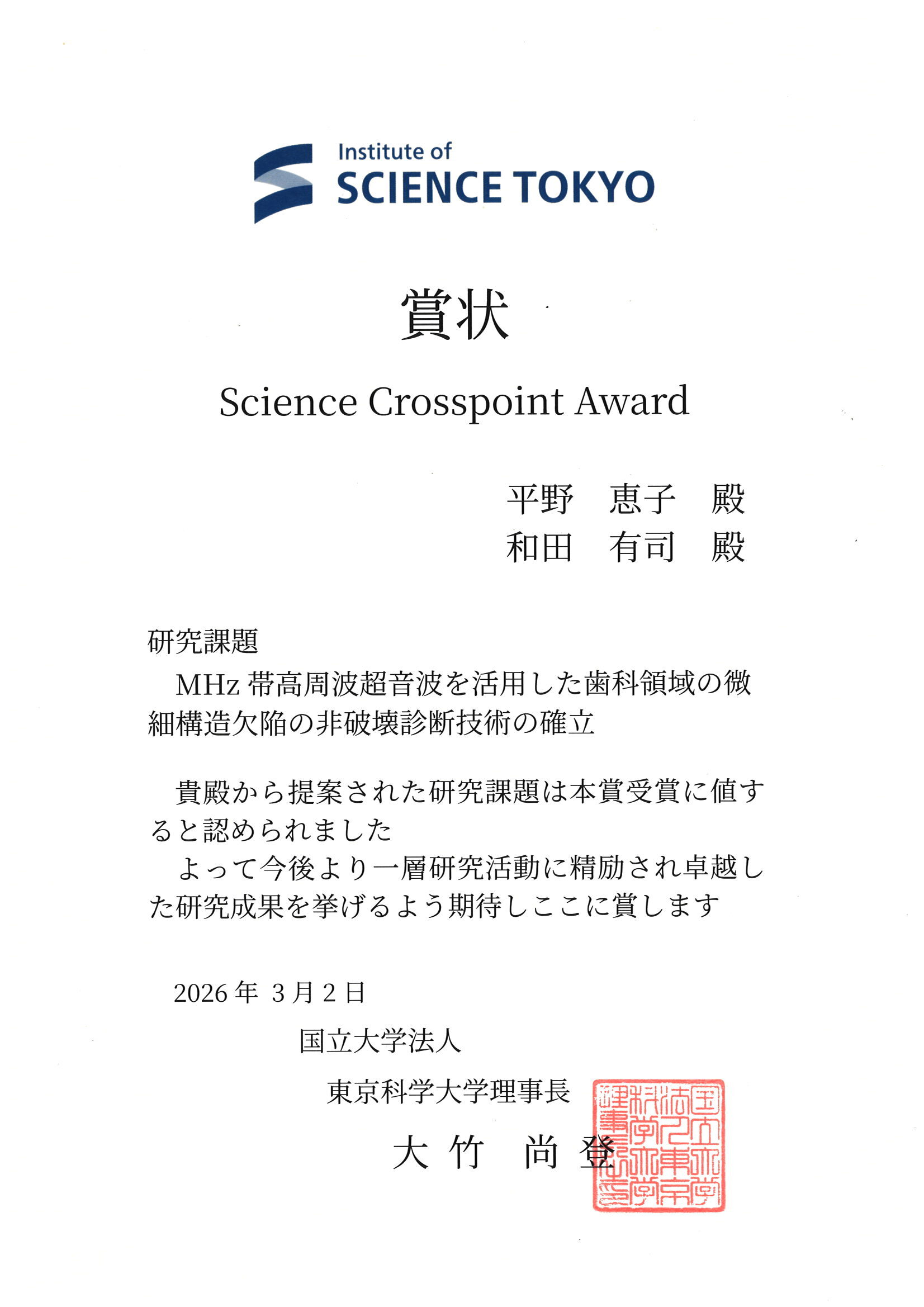 和田助教が 医歯学総合研究科 歯髄生物学分野 医員の平野恵子とともに 東京科学大学Science Crosspoint Award を受賞 2026-03-04 最終更新日時 : 2026-03-04 azuma 和田助教が、医歯学総合研究科 歯髄生物学分野 医員の平野恵子とともに 東京科学大学Science Crosspoint Award を受賞しました。 受賞対象の研究は、"MHz帯高周波超音波を活用した歯科領域の微細構造欠陥の非破壊診断技術の確立" です。