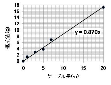 普通のLANケーブルでは、ケーブル長と抵抗値は上のような関係になりました(実測)。